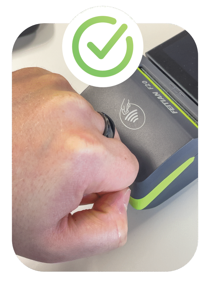 Minden készen áll! Egyszerűen viseld a fizetőgyűrűt, és érintsd a terminálhoz a kezedet ökölbe szorítva, hogy a gyűrű érintkezzen az olvasóval.